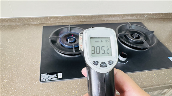 启动灶具,映入眼帘的是呈现蓝焰状态的火焰,燃烧效率极高。使用测温枪实测,火焰温度能在极短时间内飙升至305℃,为快节奏烹饪提供了坚实的热力支撑。