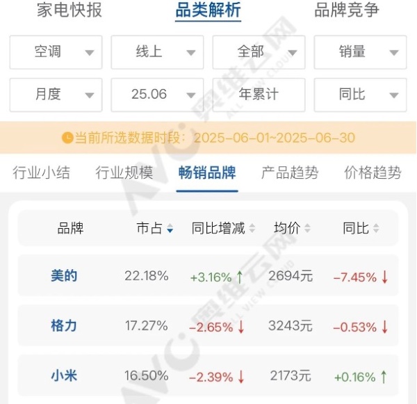 同期,奥维云网的数据显示,6月格力空调在线上市场的占比下降至17.27%,小米则与格力的差距缩至不足1个百分点,即便面对小米线上份额升至第三、海尔卡萨帝高端收入激增50%的挑战,美的空调仍实现了市场占比同比增长3.16%,以市场第一的成绩持续领跑行业。