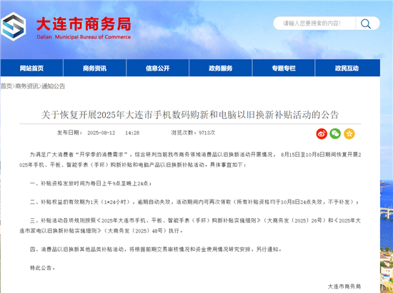 8月12日,大连市商务局发布公告,为满足“开学季的消费需求”,结合当前商务领域消费品以旧换新活动情况,大连将于8月15日至10月8日期间,恢复开展2025年手机、平板、智能手表(手环)购新补贴和电脑产品以旧换新补贴活动。补贴资格发放时间为每日上午9点至晚上24点,补贴权益有效期为1天,逾期自动失效,活动期间内可再次领取,但所有补贴资格均于10月8日24点失效且不予补发。补贴活动各项规则按照《2025年大连市手机、平板、智能手表(手环)购新补贴实施细则》和《2025年大连市家电以旧换新补贴实施细则》执行。消费品以旧换新其他品类补贴活动,将根据前期交易审核和资金使用情况研究安排,另行通知。
