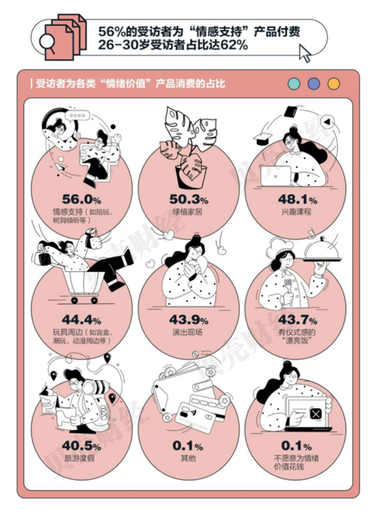 “五块钱的起送费我抠抠搜搜,几百块钱的谷子手办我说买就买!”“抠抠搜搜地花了很多钱,千金难买我乐意。”随着生活节奏的加快和社会压力的增大,年轻人对于情绪健康的重视程度持续提升,“情绪消费”应运而生并迅速崛起。从Labubu玩偶、现场演出,到手游氪金、植物疗愈,各类能够提供情绪价值、帮助年轻人进行高质量情绪调节的产品和服务,正如雨后春笋般走红。《报告》指出,56%的受访者愿意为“情感支持类”产品付费,其中18-25岁人群尤其热衷于绿植家居、兴趣课程等“自我投射型消费”。