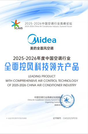 值得一提的是,美的今年推出的全面风空调凭借颠覆性的外观设计和卓越的控风科技等创新突破,在“2025-2026中国空调行业高峰论坛”上荣获“全面控风科技领先产品”大奖。这一荣誉不仅体现了行业对美的空调技术实力的高度认可,也充分彰显了其在产品创新方面的领先优势。