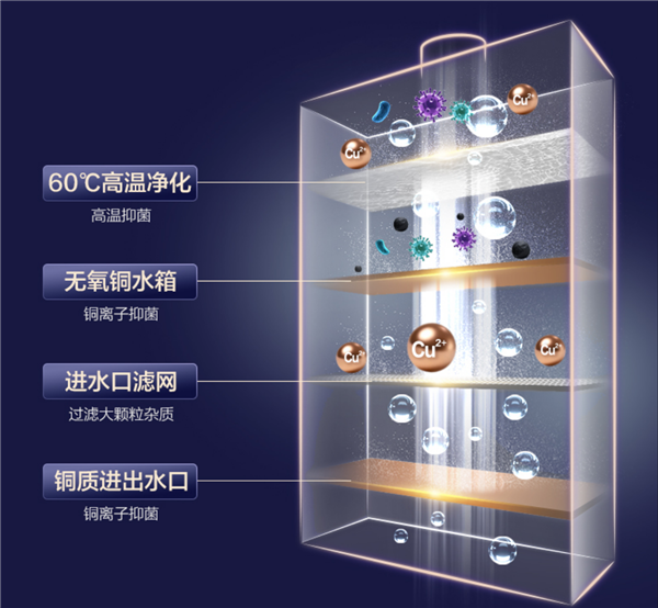 首先是高纯度无氧铜水箱,不仅耐腐蚀、抗高温、换热效率高,更能通过铜离子的天然抑菌作用,有效抑制大肠杆菌、金黄色葡萄球菌等细菌滋生。搭配60℃高温净化抑菌功能,水流经过高温杀菌后,水质更洁净,宝宝娇嫩的肌肤再也不用担心细菌刺激。