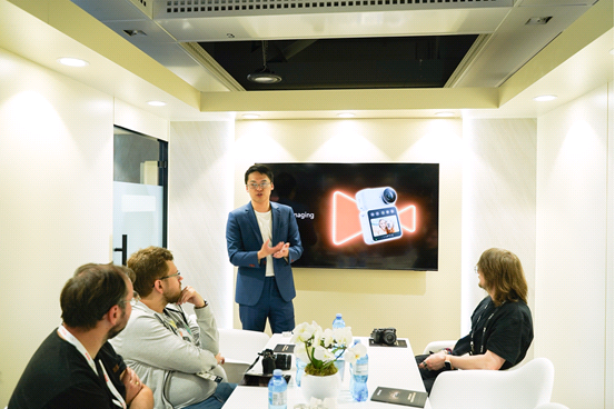 (光子跃迁负责人袁谦与媒体进行技术分享)