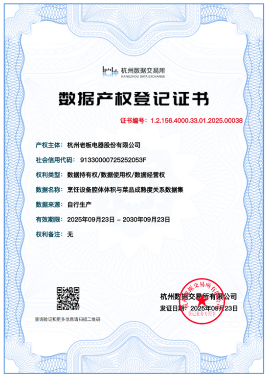 在此过程中,老板电器率先实现数据产权的重要突破。在“中国数谷”成果发布会上,老板电器一举获批7张数据产权登记证书,成为首批企业中获证数量最多的单位,率先完成了“产权明晰化”的关键一步,这也标志着其在数据要素市场的探索已从“先行”迈入“领军”阶段。对于老板电器而言,这些证书如同为其数据资产量身定制的“身份证”,首次实现数据持有权、使用权、经营权的“三权合一”,使包括热量精准识别图谱、菜谱营养与健康价值关系数据等在内的企业核心数据产品,从“沉默资源”转化为具有法律初步证据效力的“创新资产”。