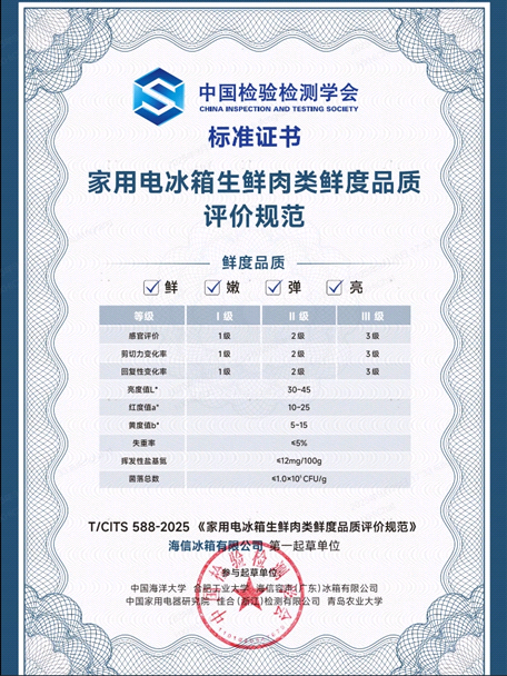 9月29日,由海信冰箱牵头制定的《家用电冰箱生鲜肉类鲜度品质评价规范》正式通过审定。这一团体标准的建立,首次为冰箱行业的“肉类保鲜”能力构建了一套科学、完整且可量化的评价体系,标志着家用冰箱保鲜技术从长期的概念宣传迈入科学实证的新阶段。