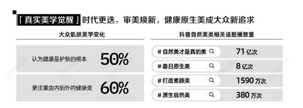 《2025抖音电商护肤趋势报告》显示,50%的受访者认为“健康是护肤的根本”,60%的受访者表示“更注重由内到外的健康美”。抖音平台上#自然美才是真的美话题播放量高达71亿次。