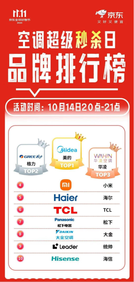 2025年双十一大促期间,美的空调在各大电商平台表现亮眼,实现多平台“百花齐放”。据最新战报显示,京东专卖店“开门红美的空调”首销12小时实现销售额突破亿元,其中无风感空调销量超10000台,在规模、份额、结构三个维度均位居第一。在10月14日京东空调超级秒杀日中,美的同样位列销售排行榜首位。