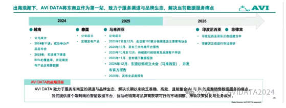 AVI DATA以“高准确度、高效率、AI+大数据智能驱动、端到端整合”为核心标准,致力于成为面向全球消费电子、家电和快消品行业的一站式、智能化大数据服务商。公司成立以来进展迅速:2024年11月产品成功发布;2025年计划实现线下渠道80%的覆盖率,并于10月发布三大电商平台报告,11月发布线下数据报告,12月在马来西亚举行东盟总部成立大会并发布官方报告;2026年将进一步发布全品类报告。目前,印度尼西亚团队正在组建,菲律宾市场调研也已启动。