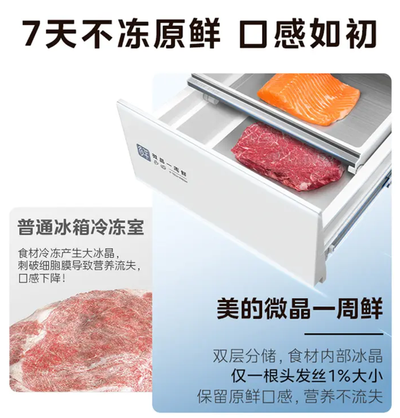 同时,美的冰箱首创的 “微晶一周鲜” 技术,能够做到7 天锁住肉类原鲜口感,真正做到“一周更鲜活”,达到国际领先水平的1级口感保鲜标准。从空间到净化,从保鲜到功能,美的熊墩墩以技术创新和选配方案,为用户带来可定制化新选择。