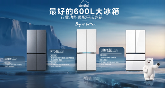 美的熊墩墩系列冰箱不仅全系覆盖600L大容积、平嵌设计、双系统、净化功能等核心需求,更以阶梯式功能选配,为消费者提供标准版、Pro版和Ultra版三大版本。其中,实用标准版,满足用户日常囤鲜、净化的基础需求;品质Pro版,让注重健康和营养的家庭可以选择带超净光波养鲜或脉冲净化等功能的型号; Ultra版独有的微晶一周鲜功能,可以实现肉类7天不冻原鲜,让想做快手菜的家庭节省了肉类解冻时间。
