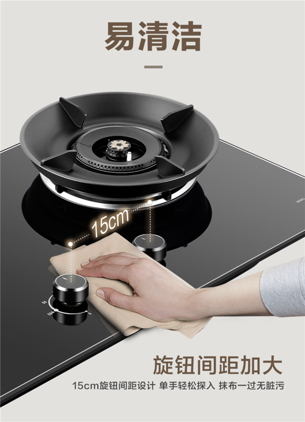 在细节处,樱花燃气灶S839G内外环齿盖均采用全铜材质,耐烧、耐腐蚀、不易变形,长久使用依旧可靠。同时,旋钮之间采用15cm加大间距的设计,单手可轻松擦拭,抹布一抹即可恢复整洁,毫不费力。