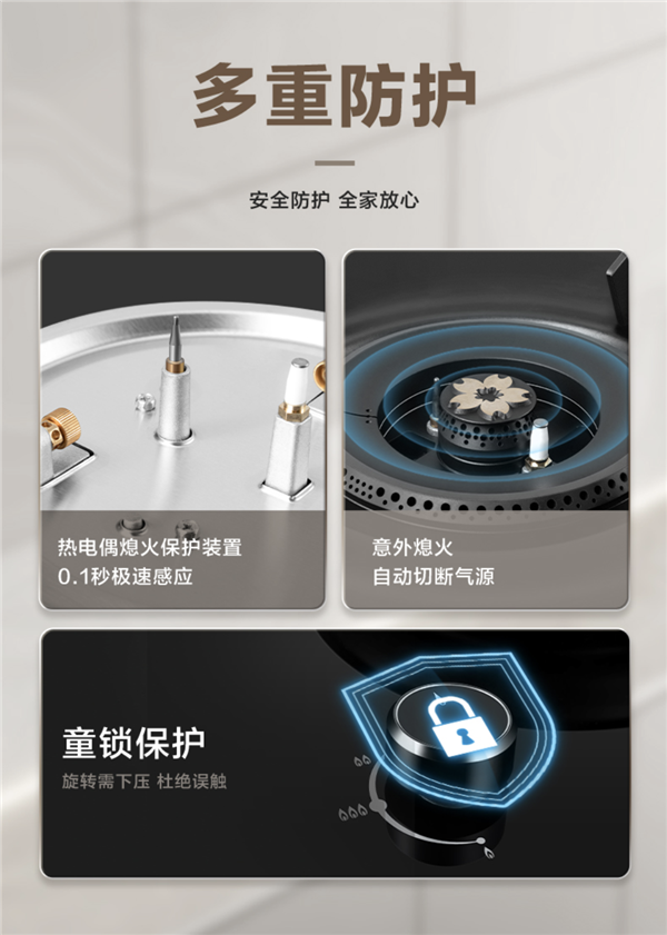 在安全层面上,樱花燃气灶S839G的多重防护,让全家放心:热电偶熄火保护装置,可在0.1秒极速感应,在意外熄火时可自动切断气源,配合按压式的童锁保护,让厨房里的每一次相聚都多一份安心。