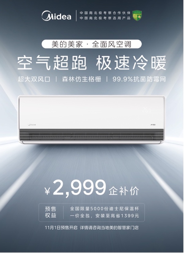 美的全面风空调预售活动于11月1日在“美的智慧家”门店全面启动。本次预售专享企业补贴价低至2999元,并推出“限量赠送迪士尼保温杯”及“一价全包安装服务” 等多重专属权益,以一步到位的诚意,助力消费者轻松升级居家生活品质。