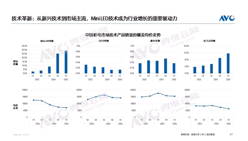 二是Mini LED主导高端市场重构。Mini LED凭借高画质、成本优势实现对OLED的弯道超车。其通过数千至数万颗微米级灯珠的分区控光技术,既保留LCD的高亮度特性,又实现媲美OLED的对比度表现,同时还实现寿命延长、成本降低。更关键的是,Mini LED在85英寸以上大尺寸市场无良率瓶颈,完美匹配家庭影院消费需求。Mini LED技术成为拉动价值增长的核心引擎。奥维云网(AVC)推总数据显示,2025上半年彩电市场Mini LED电视销量渗透率大幅增长至29%,销量同比增长超2倍,无论是从市场份额还是规模增速上看,Mini LED无疑成为彩电市场成长性最为良好的细分赛道。