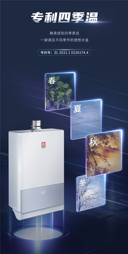 拥有专利技术的加持,樱花燃气热水器E509A创新升级的四季温功能,可一键感知季节更迭,将水温调控到最适宜的温度,无论春夏秋冬,都能享受温润包裹每一寸肌肤的体验,让身心在舒适与放松中缓缓沉静。