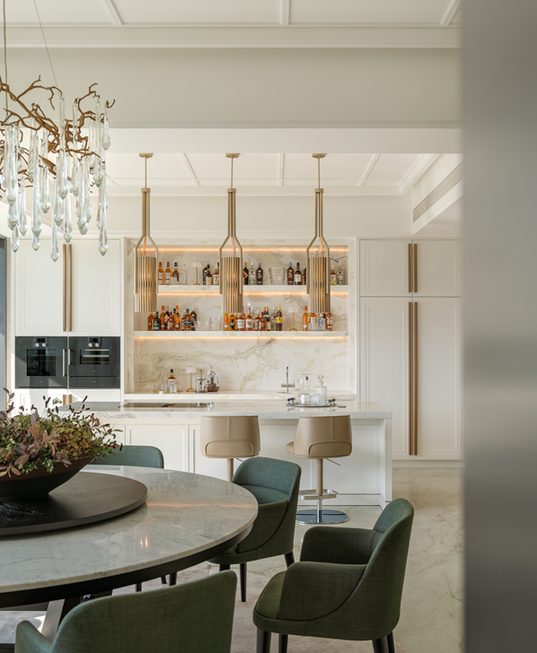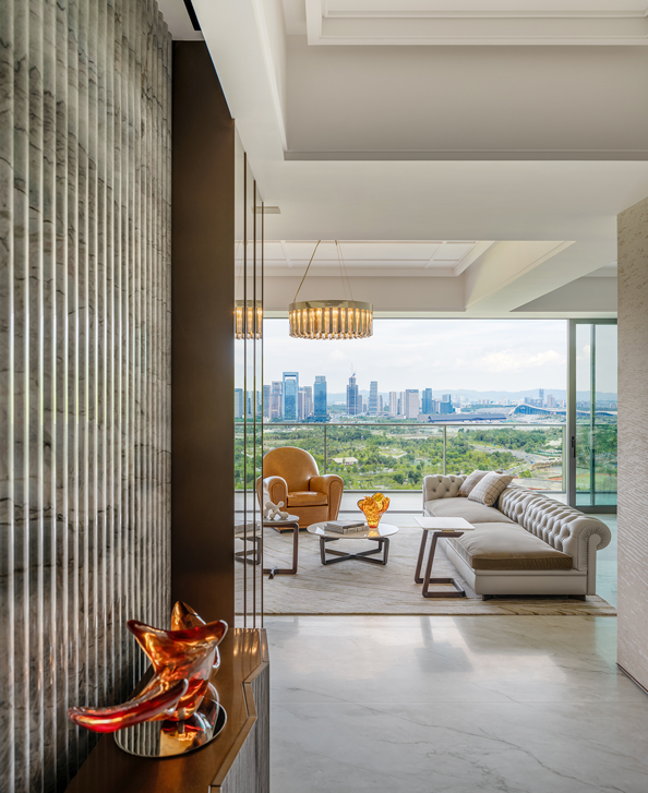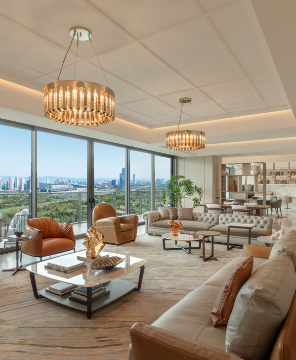 作为LACADIERE蔚蓝城市控股旗下的第三座超级豪宅传世之作,天览以当代建筑语言回应东方居住哲思,于城市天际线构建自然、艺术与生活交融的空中墅居。步入天览650㎡一层一户的奢居空间,玄关以流畅的动线自然衔接中央会客厅,巨幅玻璃移门将自然景致巧妙引入室内,赋予空间从容气度。客厅以简约线条与克制色彩,构建出既能承载日常生活,亦可安放精神需求的场域。在偏厅延伸而出的影音区,深色皮革与木质饰面碰撞出内敛雅致格调,静谧的氛围悄然隔绝外界喧嚣,为品酒洽谈及影音鉴赏提供理想场域。
