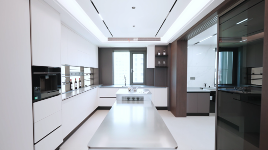 西厨岛台转角采用了一体化圆弧设计,既弱化了尖锐感,又增添了柔和的线条。同时也成为了日常生活中的高频使用区域。既是孩子放学后的作业区,也是为聚会时的临时吧台,兼具实用性与场景氛围营造,完美诠释了社交厨房的核心价值,使空间利用率达到了最大化。