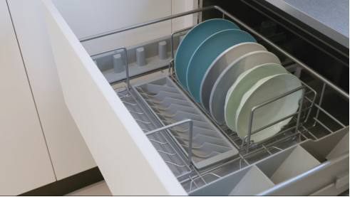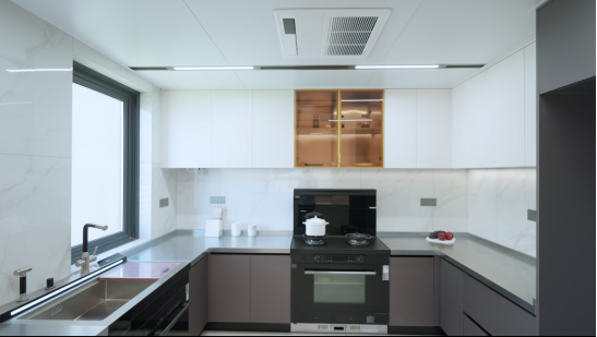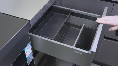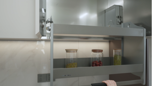 在中式厨房中,调味收纳、电动升降拉篮等运用科学的分类设计理念,依据酱油、盐、香料等物品的使用频率进行合理摆放;碗碟拉篮则通过灵活的分区规划,使不同尺寸的餐具得以分区收纳……这种精巧设计方式在有限的空间内实现了收纳容量最大化与使用效率最优化。