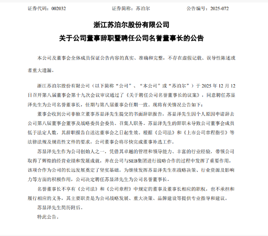 12月13日,苏泊尔发布公告,浙江苏泊尔股份有限公司于2025年12月12日召开第八届董事会第十九次会议审议通过了《关于聘任公司名誉董事长的议案》,同意聘任苏显泽先生为公司名誉董事长,任期与第八届董事会任期一致。