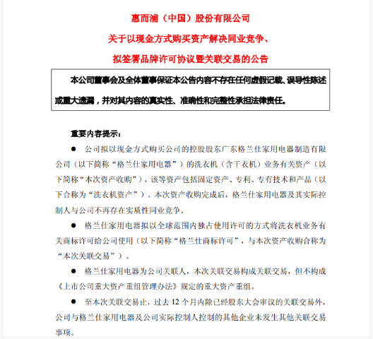 12月12日,惠而浦发布公告,公司拟与格兰仕家用电器签署《资产收购协议》,以现金方式收购格兰仕家用电器的洗衣机业务有关的固定资产、专利、专有技术和产品。经双方协商,公司收购洗衣机资产中的固定资产和专利的价格(不含税)为人民币7,461.93万元。格兰仕家用电器向公司无偿转让洗衣机业务有关的专有技术。 此外,惠而浦拟与格兰仕家用电器签署《品牌许可协议》,格兰仕家用电器拟以全球范围内独占使用许可的方式将洗衣机资产有关商标许可给公司使用。交易完成后,格兰仕家用电器及其实际控制人将不再生产、销售洗衣机产品,以解决彼此间的同业竞争问题。 综合信息显示,2021年3月,格兰仕家用电器及其实际控制人在发起对惠而浦的要约收购前,出具《关于避免同业竞争的承诺函》,明确在收购惠而浦完成后的60个月内,解决其与惠而浦可能存在的同业竞争问题。2021年5月,格兰仕家用电器发布公告称,公司正式完成要约收购,以51.1%的持股成为惠而浦控股股东。自收购后,格兰仕家用电器仍在不断增持惠而浦股份,2025年三季报显示,格兰仕家用电器持股比例为59.84%。 从业绩上来看,2025年前三季度,惠而浦实现营业收入为32.97亿元,同比增长30.61%;实现归母净利润为3.17亿元,同比增长496.88%。 在三季报中,惠而浦称,营业收入增长原因系海外市场需求旺盛,目前,海外市场是惠而浦的业绩贡献主力。2025年上半年,公司境外销售收入为21.13亿元,占到了总营收的96.48%,与上年同期相比增长了37.6%。【潮流家电网版权声明】:本网站注明转载的内容均来源于互联网,转载的目的在于传递更多信息及用于网络分享,并不代表本站赞同其观点和对其真实性负责,也不构成任何其他建议。如果您发现网站上有侵犯您的知识产权的作品,欢迎提供相关证据,发送邮件至731801816@qq.com,我们会及时修改或删除。