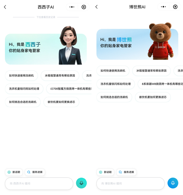博西家电旗下品牌小程序内西西子 & 博世熊的AI家电管家对话界面