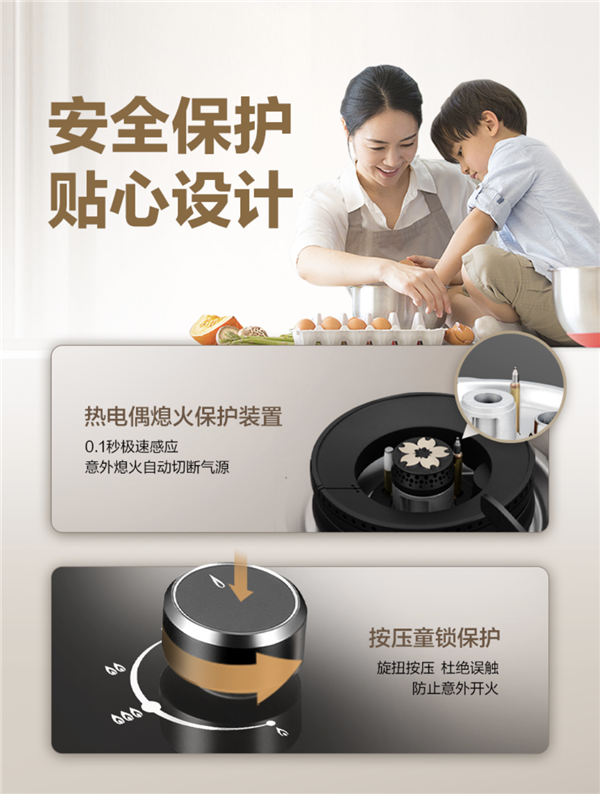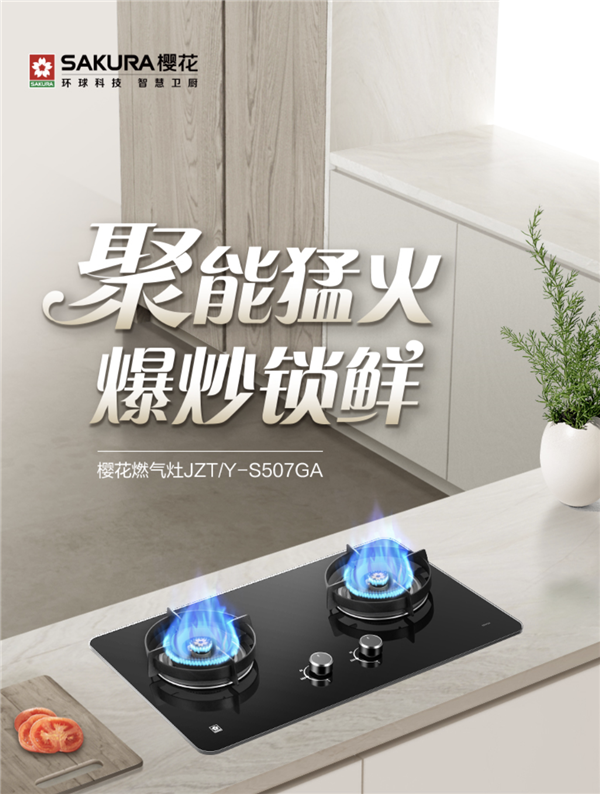 以干净利落的零秒点火功能,让烹饪的灵感尽情释放,樱花燃气灶S507GA即点即燃,让每一次烹调都以迅捷的姿态开启。哑光搪瓷聚能环可有效集中火焰,稳稳守住火力,最大程度减少热量流失,热能效表现高达63%,配合5.2kW的澎湃猛火和无段式火力微调科技,让美味时刻从容掌控。 以精致细节打造耐用易洁的厨房秩序,樱花燃气灶S507GA采用8mm黑色钢化玻璃面板,沉稳大气,嵌入式安装让整体质感自然融入现代之美。快拆式设计的炉头组件结构,炉头与汤盘可快速拆卸,便于定期清理积碳油污,延长使用寿命。不锈钢汤盘防锈抗污,经久耐用;锌合金旋钮抗腐蚀、手感稳重;钢化玻璃面板防刮耐磨,让日常打理省时省力,轻轻松松。 以安全守护,让每一次使用都安心无虞,樱花燃气灶S507GA采用按压式童锁保护装置,旋钮须先下压再旋转方能开启,用精密的结构设计守护每一个家庭的无忧舒适。热电偶熄火保护装置更以0.1秒的极速响应能力,在意外熄火的第一瞬间迅速切断气源,为烹饪空间筑起牢固的安全屏障。 樱花燃气灶S507GA以精准可控的火力,让美味与效率并存,轻松满足全家人的味蕾享受。 智慧化恒温,四季皆舒适