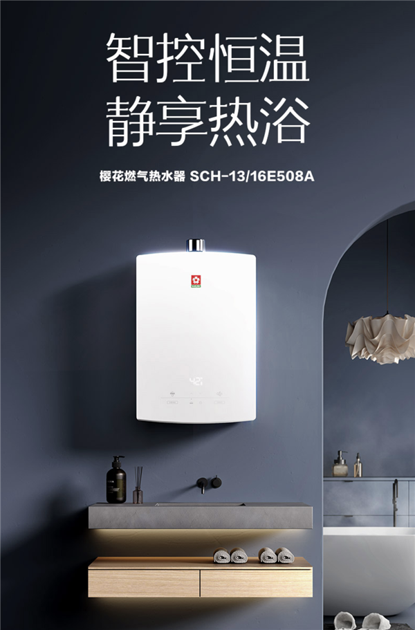 随心调控合适水温,樱花燃气热水器E508A采用三分段稳燃技术,最低温升≤4K,可根据季节变化自主设定四季皆宜的水温,无论盛夏酷暑还是寒冬冷冽,都能精准应对。洞察家庭成员的不同用水需求,樱花燃气热水器E508A更贴心设计35℃~70℃的宽幅调温模式,让水温切换更随心,让温暖更懂你的心。 以全天候的防护,让寒冷时节也能倍感温柔,樱花燃气热水器E508A配备陶瓷电子防冻保护机制,当环境低于指定温度,将自动开启加热,确保在冬季依旧稳定运行,让热力在最需要的季节从不缺席。更有多重安全防护体系,如意外熄火保护、干烧过热保护、残火检测保护、漏电保护、60分钟定时保护、双重防泄漏等全方位的全程监控,让家居用水更安心。 樱花燃气热水器E508A以智慧驱动的恒温体验,为现代家庭打造出更细腻惬意的用水体验,重塑家的温暖质感。 樱花卫厨以强劲实力和创新精神,匠心雕琢厨卫产品的细节,让家的温柔尽情舒展,持续打造更安心、更舒适的无忧精致空间。作为专业的厨卫品牌,樱花坚持以智能科技赋能理想生活,与优雅相伴,与品质同行,让每个用户都能在家居日常中,找寻到有序、有温度、有质感的美好生活方式。