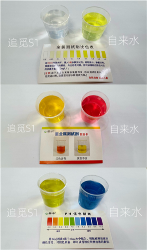 PH值测试中,自来水呈碱性,追觅S1过滤的水更接近中性,水质口感变得清甜且柔和,过滤效果显著可见。
