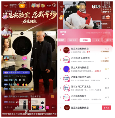 以追觅洗衣机为例,不仅登顶抖音大家电直播带货榜第一,直播同时在线人数10万+,总裁专场直播GMV更是突破百万,在线人数峰值达到18万。在此协同增长效应下,追觅冰箱、空调、洗衣机等大家电在抖音直播间销售额普遍实现3-5倍增长,多个直播间日均场观破万,点赞数突破百万。