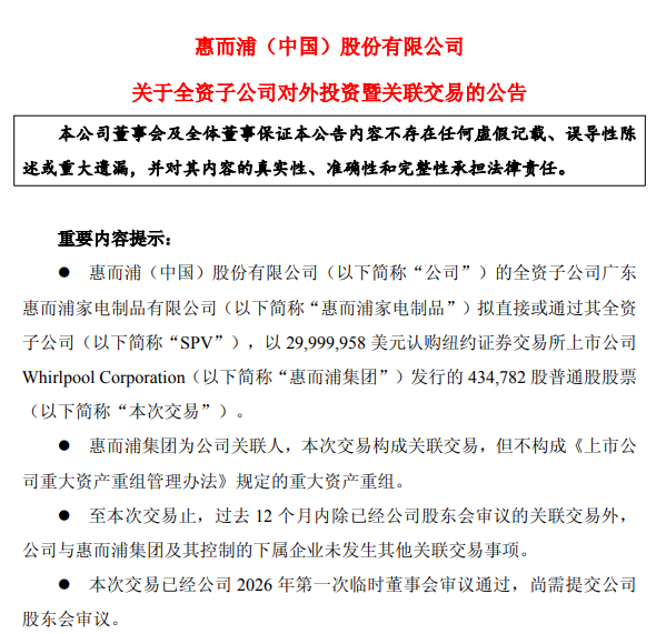 2月26日,惠而浦(中国)股份有限公司发布公告,全资子公司广东惠而浦家电制品有限公司(以下简称“惠而浦家电制品”)拟直接或通过其全资子公司(以下简称“SPV”),以29,999,958美元(约合人民币2.17亿元,按当时汇率估算)认购纽约证券交易所上市公司Whirlpool Corporation(以下简称“惠而浦集团”)发行的434,782股普通股股票。