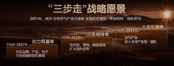 殷必彤在演讲中提到,海信空气产业已确立了“三步走”战略愿景:锚定2031年成为全球空气产业引领者的目标,分三个阶段完成产业的全球化进阶。按照战略规划:2026-2027年,产业将聚焦能力筑基,夯实品牌、产品、技术与供应链的领先基础;2028-2029年加速并跑相持,扩大科技、营销、制造领域优势;2030-2031年实现全面引领,推动海信空气产业迈入全球第一梯队,以技术领先、体验独特、绿色担当重塑行业格局。