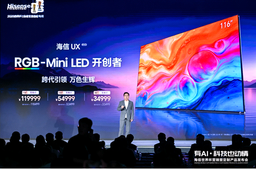 海信 UX2026 款推出 85、100 以及全球最大的116英寸 RGB-Mini LED 电视三大黄金规格,零售价分别为 34999元、54999元、119999元。