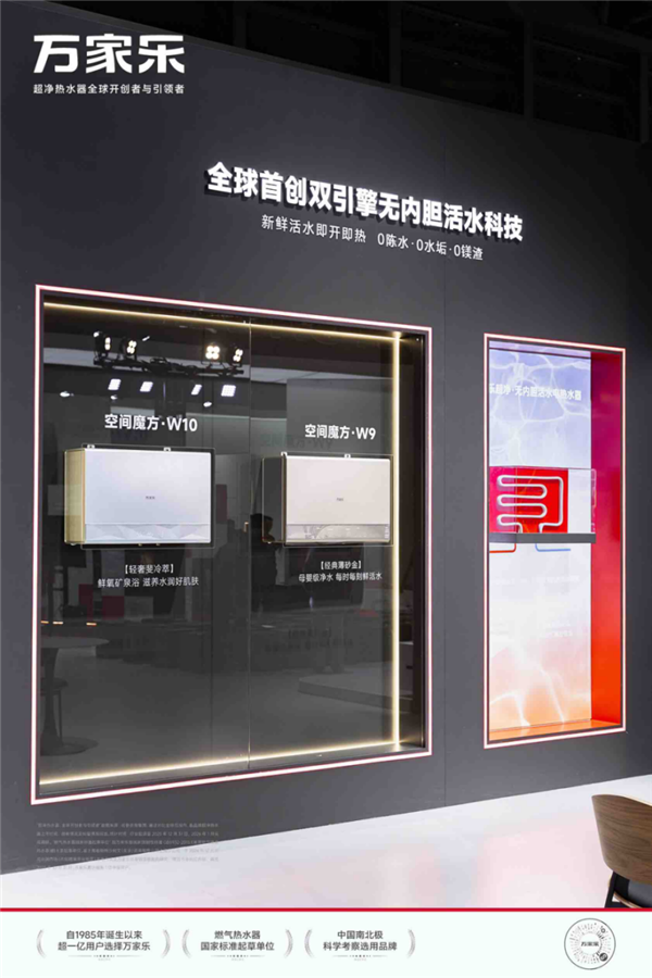 针对传统电热水器储水内胆易积垢、易滋生细菌的行业沉疴,万家乐发布了“万家乐超净热水器-空间魔方W9”。其核心在于彻底摒弃了笨重的内胆结构,采用特殊超导材料打造精密水路。
