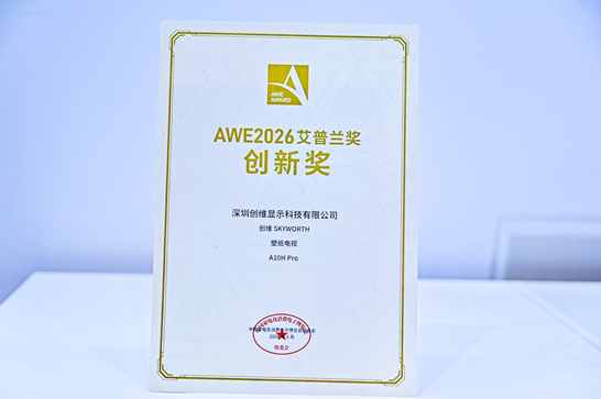 3月12日,在2026年中国家电及消费电子博览会(AWE2026)现场,备受行业关注的艾普兰奖正式揭晓,创维旗下三款旗舰产品——创维壁纸电视A10H Pro、创维「超净洗」超薄全嵌滚筒洗衣机、创维光伏能亮站,凭借突破性创新性美学设计与硬核技术实力,均一举摘得“AWE2026艾普兰创新奖” 。
