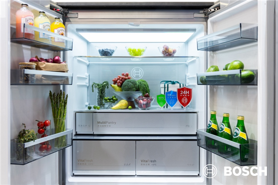 如果说“全域净界护盾”守护的是空间的干爽,那么博世家电全新三重盾护十字门冰箱的保鲜科技则致力于锁住食材的新鲜本味,让每一次开启冰箱都成为“鲜味初醒”的美妙时刻。该系列的高配版本更搭载了博世家电独家专研的真空保鲜功能,延续食材9倍鲜活日常;更搭载新一代活氧净Pro技术,7*24小时监测冰箱内部食材存储情况,主动触发释放双倍高浓度活氧,高效实现杀菌、净味、降农残与防霉,构建起强大的全域净化屏障。无论是新鲜的绿叶蔬菜还是珍贵的深海鱼获,都能最大程度地保持食物鲜美的口感,全方位守护家人的舌尖健康。