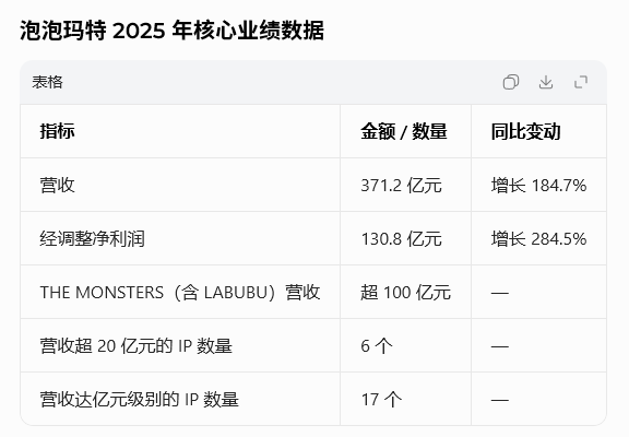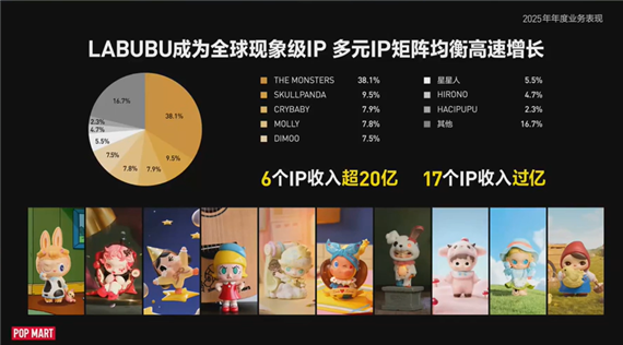 从业绩上来看,2025年,泡泡玛特实现营收371.2亿元(人民币,下同),同比增长184.7%;经调整净利润130.8亿元,同比增长284.5%。业绩高速增长的背后,IP矩阵全线发力:LABUBU所在的THE MONSTERS营收首次突破一百亿元,6个IP营收超20亿元,17个IP营收达到亿元级别。