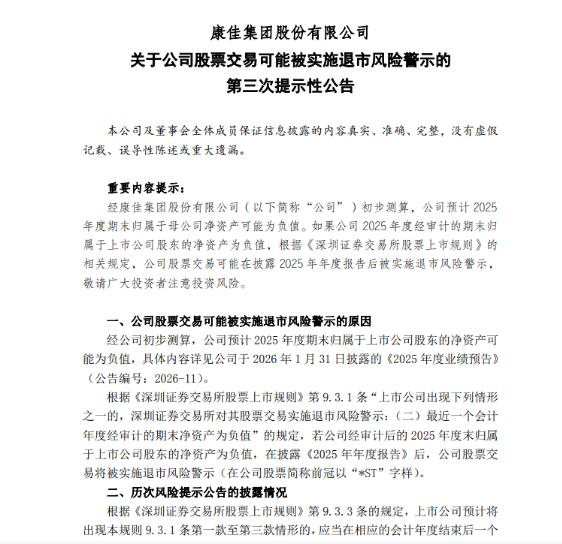 康佳发布的2025年度业绩预告显示,预计2025年全年归母净利润将亏损125.81亿元至155.73亿元,亏损额同比急剧扩大。预计期末归属于上市公司股东的净资产为-53.34亿元至-80.01亿元。