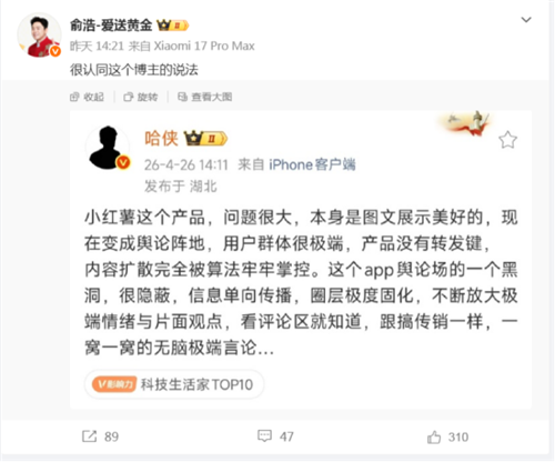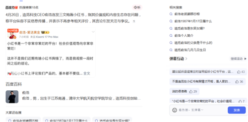 4月27日,该事件在百度等平台进一步发酵。热搜页面侧边弹幕中,不少用户对俞浩的观点表示支持,认为平台存在虚假信息泛滥等问题。