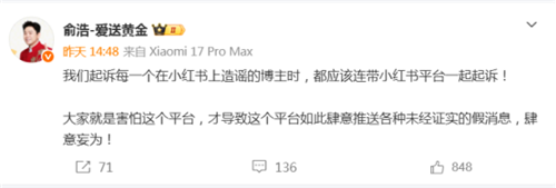 第三条微博则直接发起了倡议:“我们起诉每一个在小红书上造谣的博主时,都应该连带小红书平台一起起诉”,认为全行业对平台的忌惮,纵容了其肆意推送未经证实的假消息。