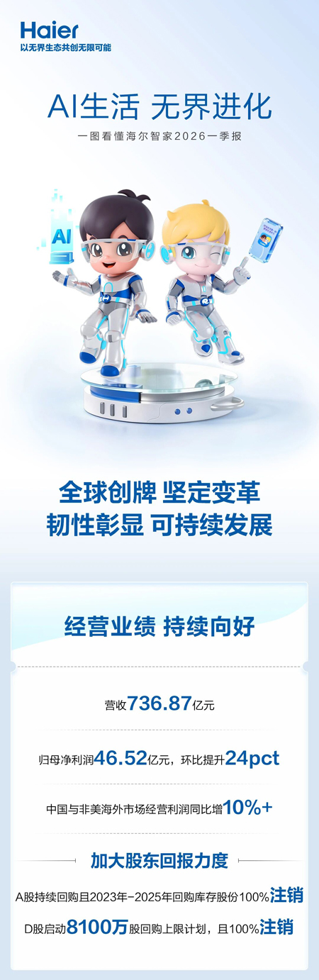 4月27日晚间,海尔智家发布2026一季报:Q1归母净利润环比提升。剔除北美市场影响,整体经营利润两位数增长。积极回报股东,将2023-2025年回购计划中剩余的全部库存股注销,同时推出D股回购方案,拟最高回购约8100万股且全部注销。
