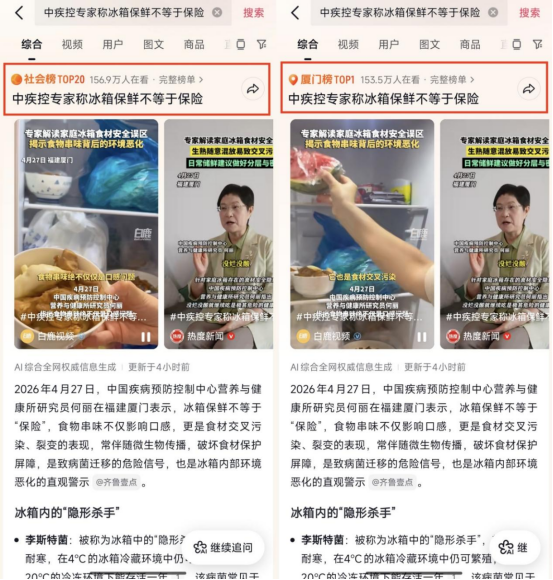 直播结束后,美的冰箱PST+智能净化技术因硬核的技术实力以及中疾控专家的权威输出,完成热点话题打造,相关话题词成功登陆抖音社会榜TOP20、厦门同城榜TOP1,美的冰箱,以硬核科技定义健康新标准。